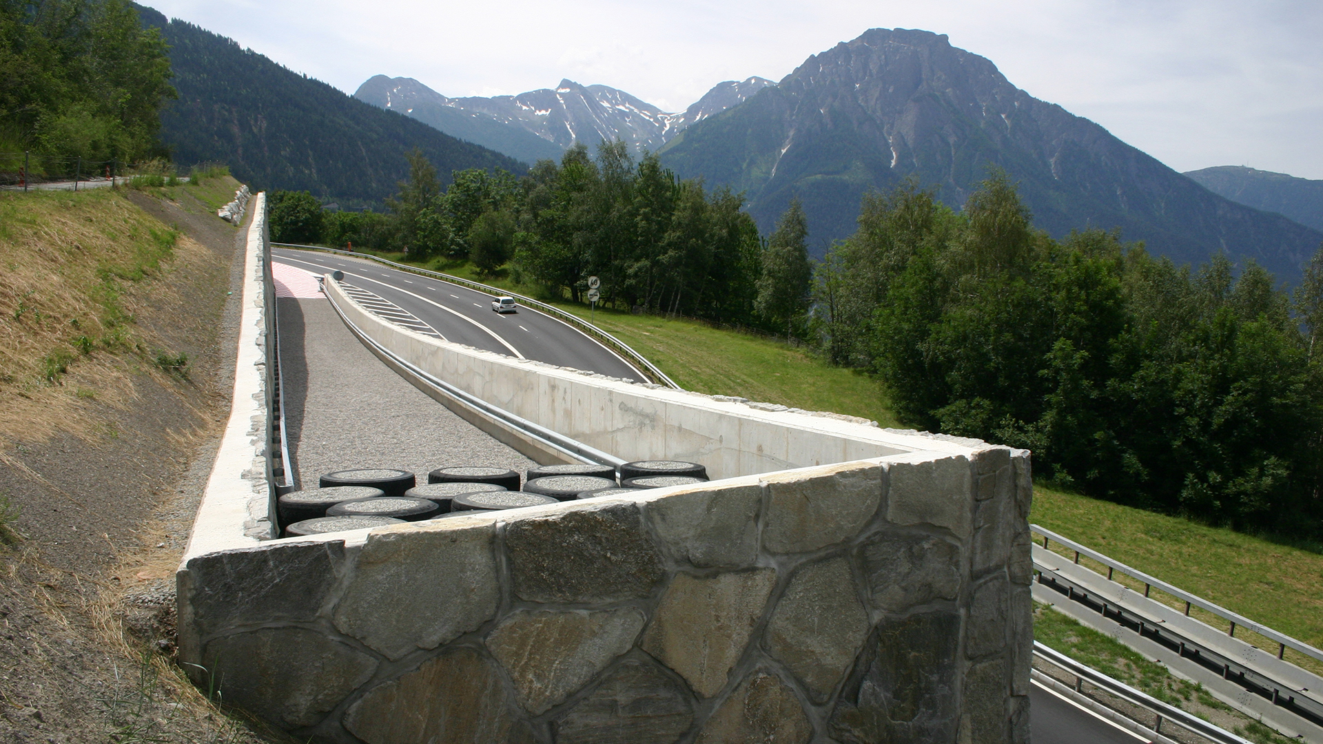 Zeitgleich wurde unterhalb der Kurve seitlich neben der Strasse ein Wasserrückhaltebecken gebaut. Dieses Becken fängt Regen- und Schmelzwasser sowie – im Falle eines Brandes oder Unfalles – Löschwasser auf, das später der Strassenabwasser-Behandlungsanlage zugeführt wird.