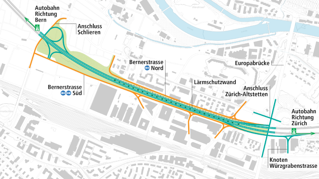 Der vor über 50 Jahren erstellte Abschnitt der Autobahn A1 im Gebiet Zürich-Grünau/Altstetten muss umfassend saniert werden. Stadt und Bauherrschaft nutzen die Chance, mit der Erneuerung des Autobahnabschnitts das Quartier Grünau städtebaulich aufzuwerten und besser vor Verkehrslärm zu schützen.