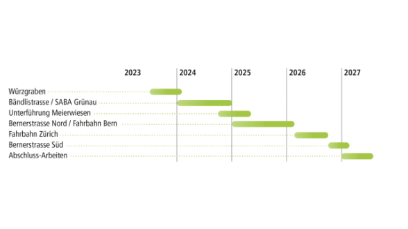 Die öffentliche Projektauflage fand im Dezember 2010 statt. Einsprache- und Beschwerdeverfahren bis zum Bundesgericht dauerten mehrere Jahre. Das Bundesamt für Strassen ASTRA hat die überarbeiteten Erleichterungsgesuche für Schallschutzmassnahmen im September 2016 beim Eidgenössischen Departement für Umwelt, Verkehr, Energie und Kommunikation UVEK eingereicht, das am 7. Juni 2017 über die Neubeurteilung Lärm entschieden hat. Am 27. Juli 2017 wurde die entsprechende Plangenehmigungsverfügung (PGV) rechtskräftig. Nach den geleisteten Vorarbeiten für die Werkleitungen in der Bernerstrasse Süd und am Knoten Würzgraben, den Arbeiten an der Unterführung Bändlistrasse sowie 2024 am Anschluss Schlieren, finden die Hauptarbeiten an der A1 von Herbst 2024 bis Sommer 2027 statt.